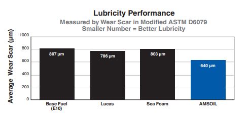 The intense heat of combustion and limitations of the oil-control piston ring result in a lack of oil at the top of each cylinder. AMSOIL Upper Cylinder Lubricant’s unique additives provide that missing lubrication to fight piston-ring and cylinder wear, maximizing engine compression and horsepower. Its lubricity improvers also aid in protecting fuel injectors and other fuel-system components from wear, helping ensure excellent performance and long-life. AMSOIL Upper Cylinder Lubricant delivers 18 percent more lubricity than Lucas* and 20 percent more than Sea Foam* for better retention of horsepower and fuel economy (see chart below).